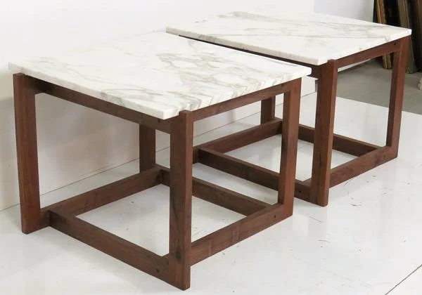 Marble top walnut frame side tables