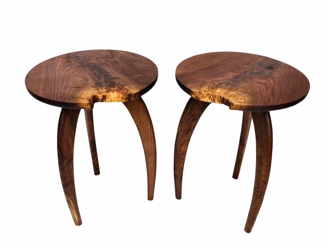 Pair of book matched, crotch, live edge walnut side tables
